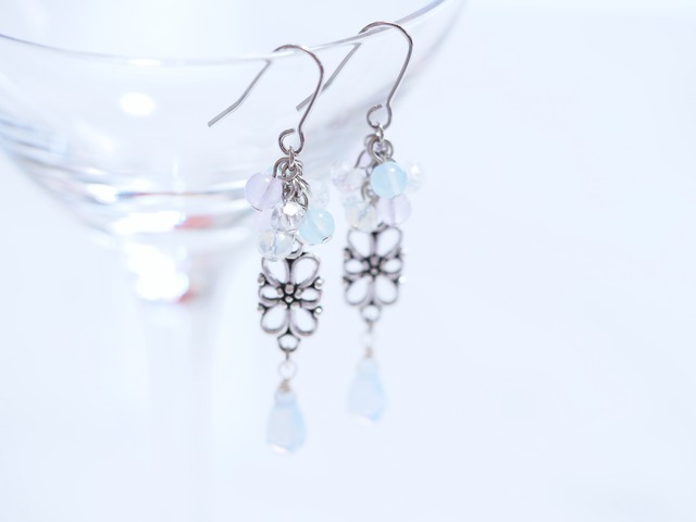 天然石 2色のミルキージェード キラキラフラワー チェコドロップ ピアス/イヤリング P0290 E0290