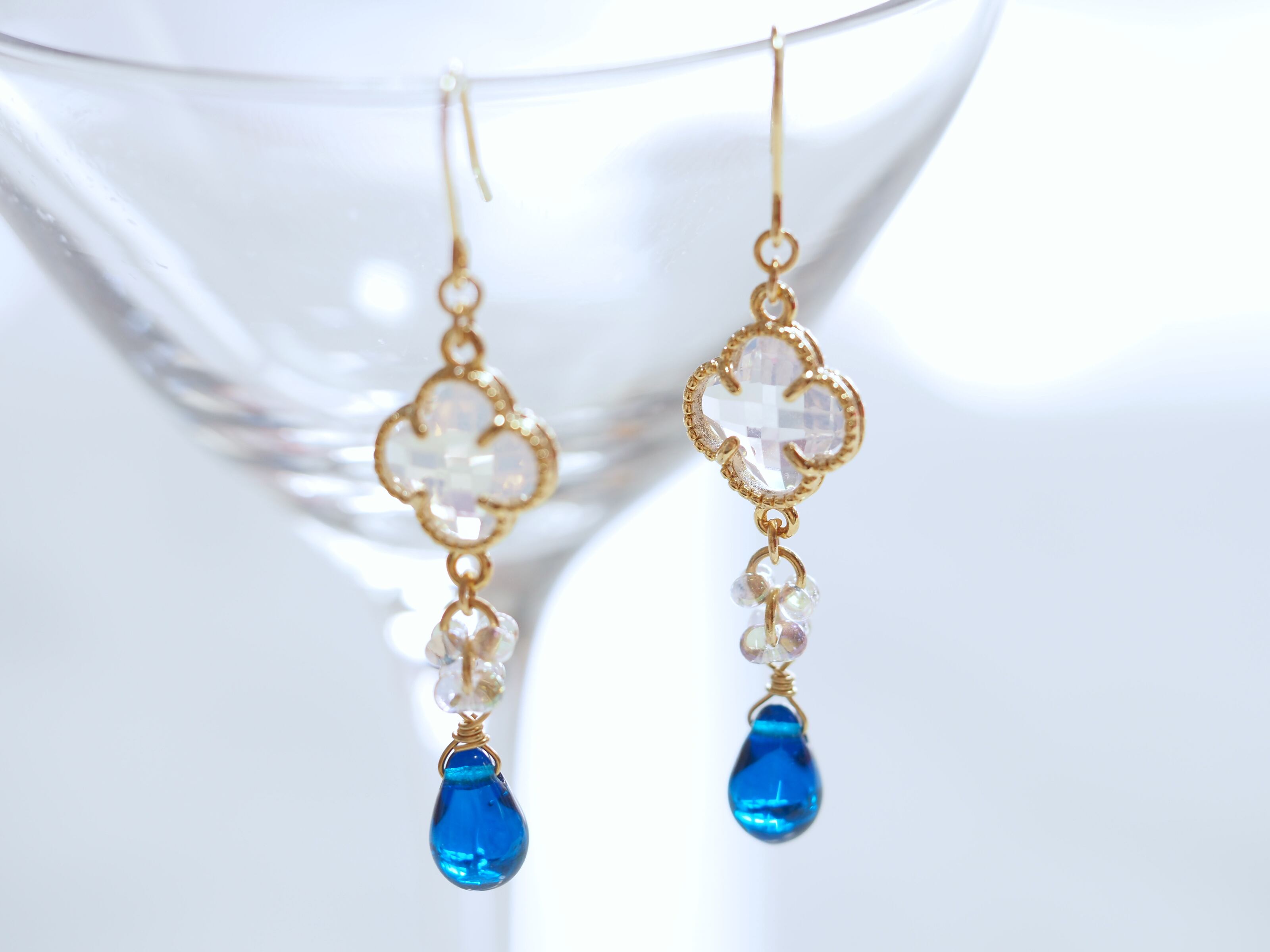 真っ青な涙型パーツとミルキーホワイトの四つ葉のクローバーを繋げて