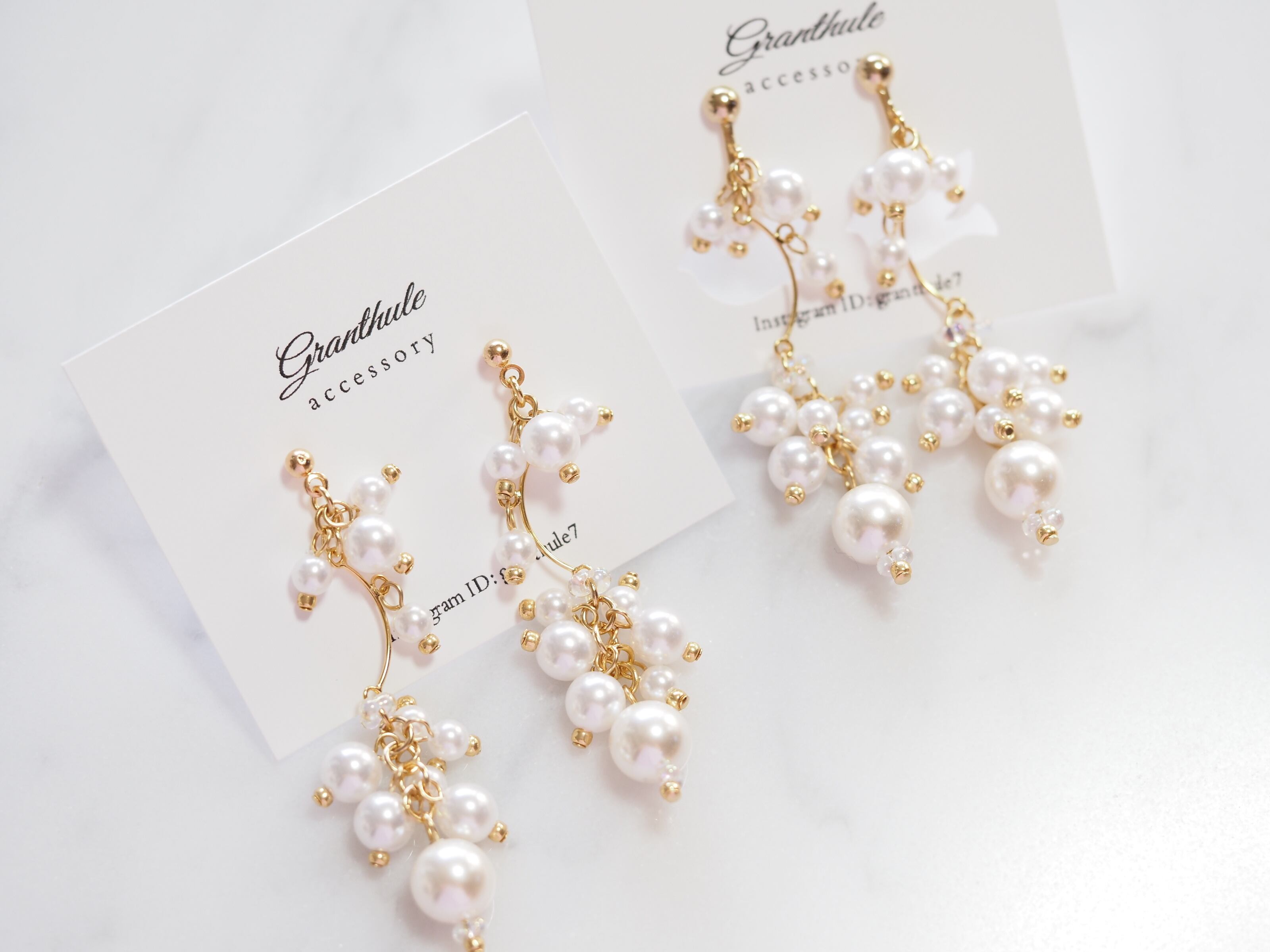 大小のパールが重なり合い、一番下には特に輝く貝パールが施され、視線を集めること間違いなしです。