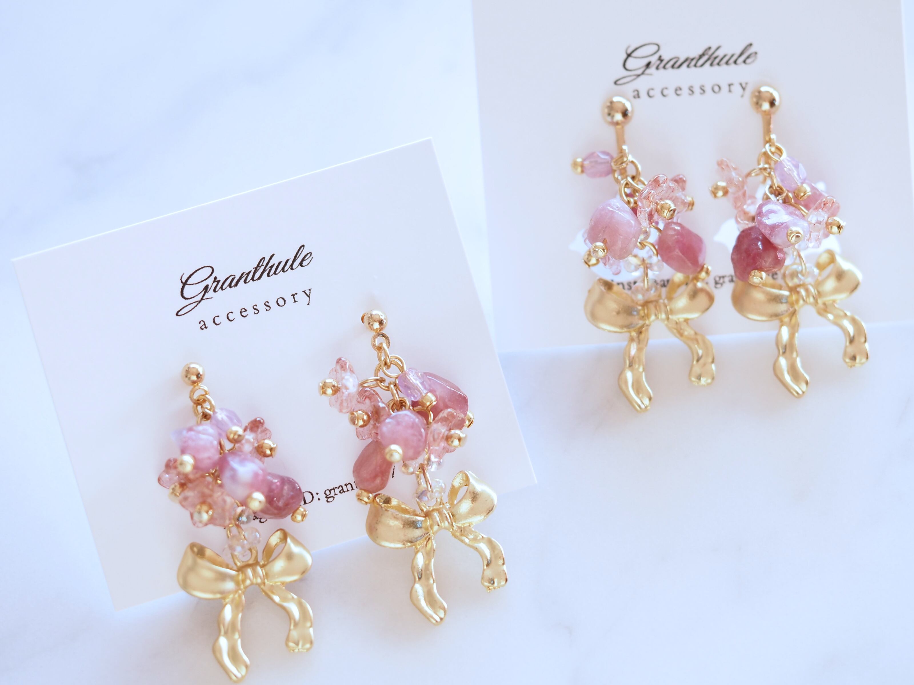 耳元で優雅に揺れる「ナチュラルフローラル・ピンクトルマリンピアス」は、